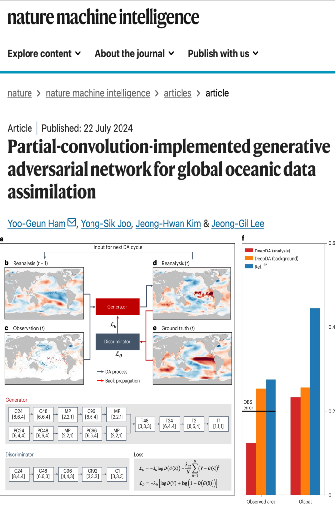 위성, 레이다, 해양 부이 등 다양한 관측 자료에는 결측과 불균질성이 존재합니다. 이러한 문제를 해결하기 위해 이미지 처리 기반 딥러닝 기법을 활용한 AI 기반 자료동화(Data Assimilation) 기법을 개발하여 고품질 재분석장을 생성합니다. 또한 기존의 관측 기반 자료동화 과정과 예측 모델 기반 예측 과정을 통합하여 AI 기반 End-to-End 전지구 모니터링 및 예측 시스템을 구축하는 연구를 수행합니다.